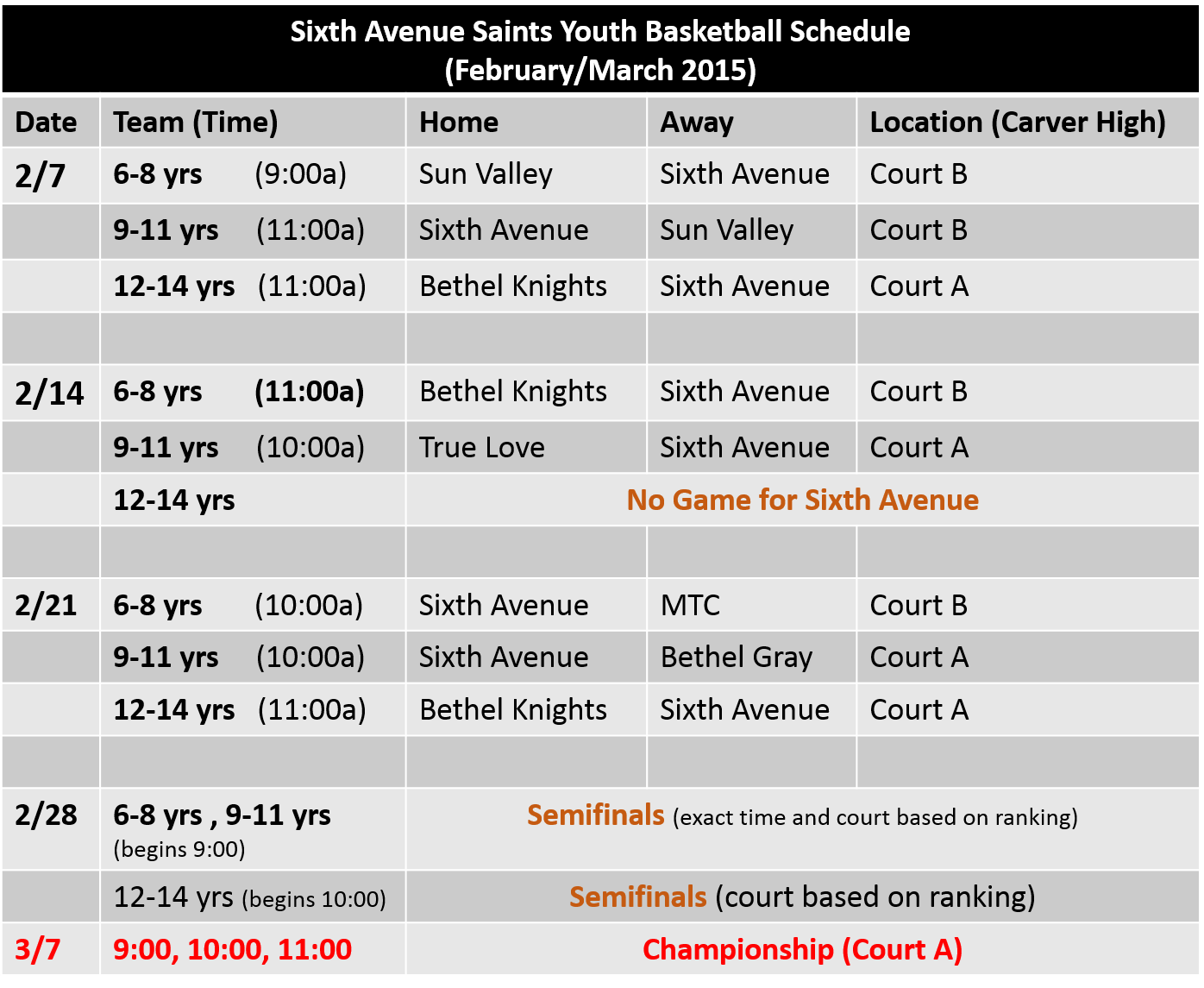 Sixth Avenue Saints - Feb,Mar Schedule